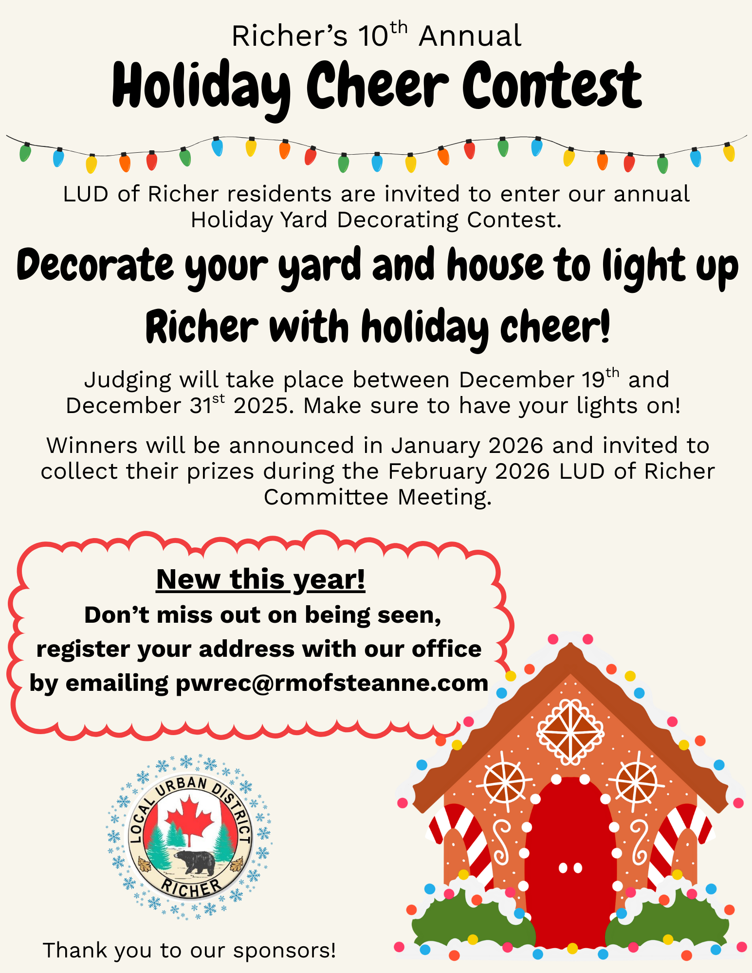 The name may have changed, but the fun stays the same. Decorate your yard and house to light up Richer with holiday cheer and for a chance to win prizes! So we don't miss any of the great decorations, register your address with our office!